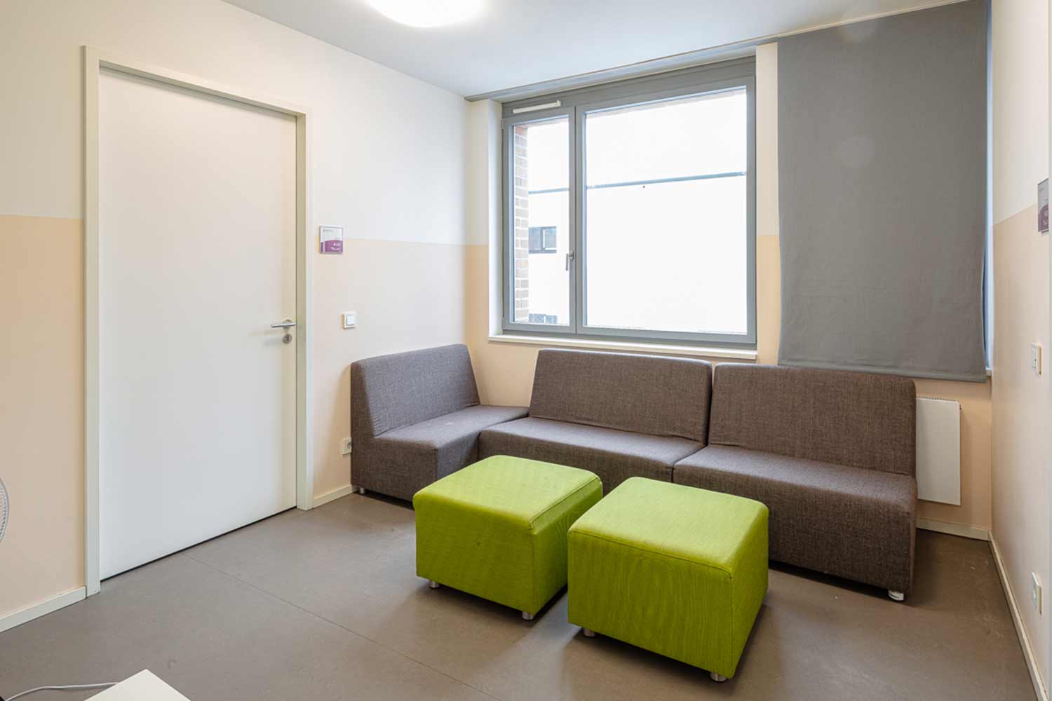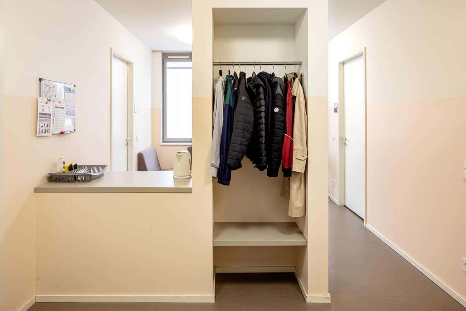 Auf jeder Etage gibt es eine weitere Einheit, die für alle Bewohner*innen der Etage nutzbar ist. Dort gibt es eine Teeküche, ein Arbeitszimmer zur Erledigung von Hausaufgaben und ein Wohnzimmer mit Couch und TV-Gerät. Zusätzlich stehen den Bewohnern Kühlschränke mit abschließbaren Fächern zur Verfügung. Weiterhin verfügt jede Etage über ein Betreuerzimmer für die pädagogischen Fachkräfte, die für die Erledigung anfallender Büroarbeit, Dokumentationen u.ä. benötigt werden.
