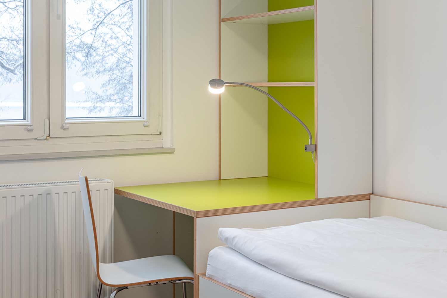 Auf 13 von 14 Etagen wohnen hier 312 Bewohner*innen, überwiegend der Sekundarstufe I, zusammen. Jede Etage unterteilt sich in fünf separate Wohneinheiten bei maximal 24 Bewohner*innen pro Etage. Eine Wohneinheit wiederum besteht aus zwei oder drei Doppelzimmern mit Bad und separaten Toiletten. Im Bereich des Flures jeder Wohneinheit gibt es einen offenen Raum zur gemeinsamen Nutzung. Die Zimmer sind mit je zwei Betten, Schränken, Schreibtischen und Stühlen ausgestattet.